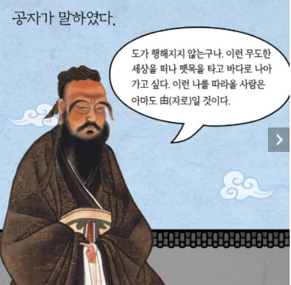 공자께서 "도가 행해지지 않으니, 내 뗏목을 타고 바다를 항해하려 한다. 이때 나를 따라올 사람은 아마 由(자로)일 것이다.”라고 하셨다. 자로(子路)가 이 말씀을 듣고 기뻐하자, 공자께서는, “由는 용맹을 좋아함은 나보다 나으나, 사리를 헤아려 맞게 하는 것이 없다.”라고 하셨다.