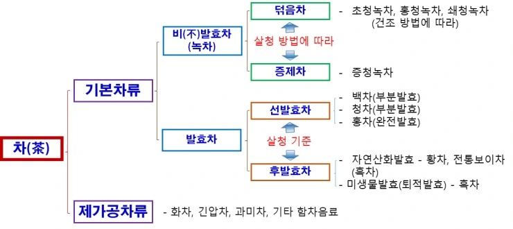 차의 분류는 가장 먼저, 기본 차류와 재가공 차류로 분류되는데, 기본 차류는 다시 서로 다른 제다공정 또는 제다기술상의 차이로 인해 각기 다른 차류들로 세분화된다.