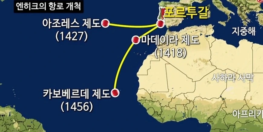 엔히크 왕자의 후원으로 1419년 주앙 곤살베스 자르쿠(João Gonçalves Zarco)와 트리스탕 바스 테이셰이라(Tristão Vaz Teixeira)가 마데이라제도를 발견해 해당 지역을 모두 식민화하였다. 그리고 1427년에는 곤살루 벨류(Gonçalo Velho) 등이 아조레스제도를 발견했다.