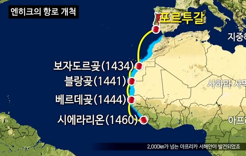 그리고 1444년에는 바르톨로뮤 디아스(Bartolomeu Dias)의 아버지인 디니스 디아스(Dinis Dias)가 아프리카 대륙의 서쪽 끝인 베르데곶(Cap Vert)에 이르렀다. 1450년대에는 카보베르데(Cabo Verde) 군도를 발견했고, 1460년대에는 지금의 시에라리온 연안까지 도달했다. 이로써 엔히크 왕자는 사하라 사막 남쪽 지역을 잇는 항로를 개척하겠다는 원래의 목적을 이루었다.