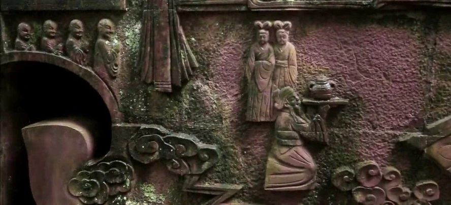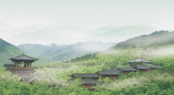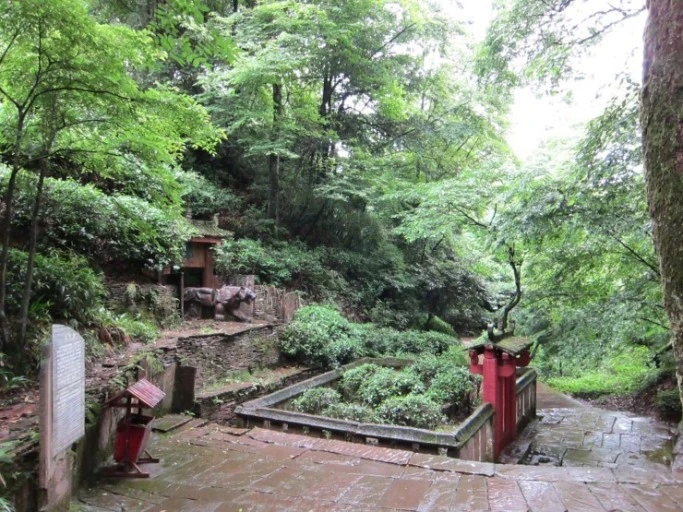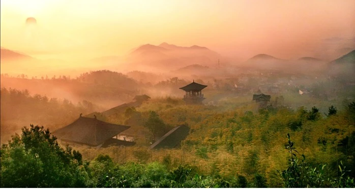 몽정산 정상 아래의 다신전(茶神殿), 오리진의 모습이 보인다.