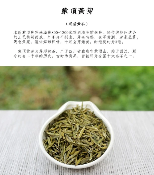 황아(黃芽)는 살청(殺靑) 후 민황(悶黃)의 공정을 거쳐 포장하여 만든다. 황색의 차로 맛이 향기롭고 순하다.
