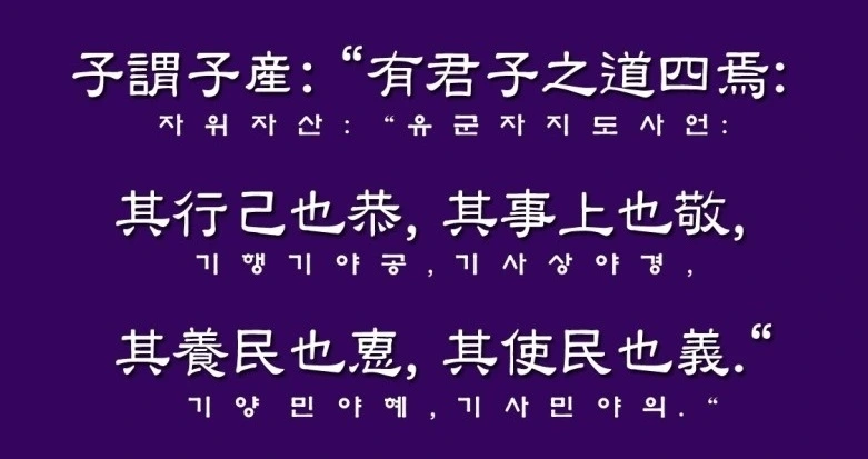 공자께서 자산(子産)을 두고 평하셨다. “군자의 도가 네 가지나 있었으니, 몸가짐이 공손하며, 윗사람을 섬김이 공경스러우며, 백성을 기름이 은혜로우며, 백성을 부림에 의로웠다.”