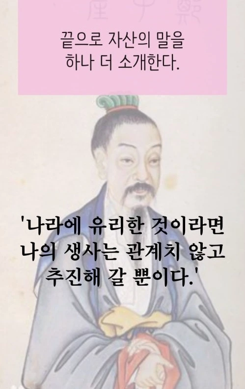 정리하자면, 그는 자타가 공인했던 명재상이었고, 강대국 틈에서 제대로 힘 한번 펴보지 못했던 정(鄭)나라를 키워냈던 훌륭한 정치가였다. 그가 죽음을 맞이했던 당시 공자의 나이가 서른이었으니, 공자보다 한 세대 위의 정치가로 1세대 선배에 해당하는 인물이었다.