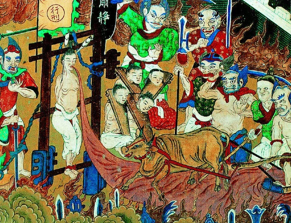 발설지옥; 혀를 뽑아 그 위를 소가 갈게 한다.