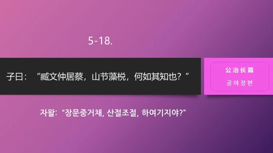 공자께서 말씀하셨다. “장문중(臧文仲)은 큰 거북을 보관하되 기둥머리 두공에는 산 모양을 조각하고 들보 위 동자기둥에는 수초를 그렸으니, 어찌 지혜롭다 하겠는가?”