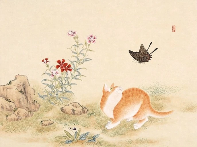 하지만, 이는 당나라 시절부터 그림을 그리는 중국의 법식이었다. 당시에 중국에서 모란을 그릴 때는 나비와 고양이를 함께 그렸다. 모란은 부귀를 상징하며, 고양이는 ‘모(耄)’로 70세를 상징하며, 나비는 ‘질(耋)’로 80세를 상징한다. 즉, 모란과 나비, 고양이를 함께 그리면 부귀 모질이란 뜻이 되어 70~80세가 되도록 부귀를 누린다는 뜻이 되는 것이다. 그러한 이유로 모란에 나비만 함께 그리지 않는 것은 나비의 한자음이 80을 의미하는 한자의 음과 같아 부귀영화를 80으로 제한하는 의미가 있어 함께 그리지 않았다. 굳이 그려야 할 경우에는, 반드시 모란과 고양이 나비를 함께 그려 7, 80으로 이어 계속 부귀영화를 누리라는 의미로 그린 것이다.