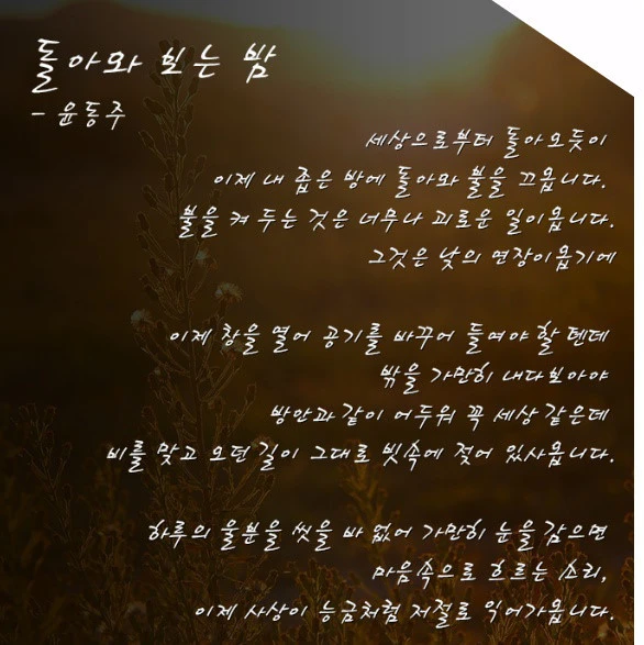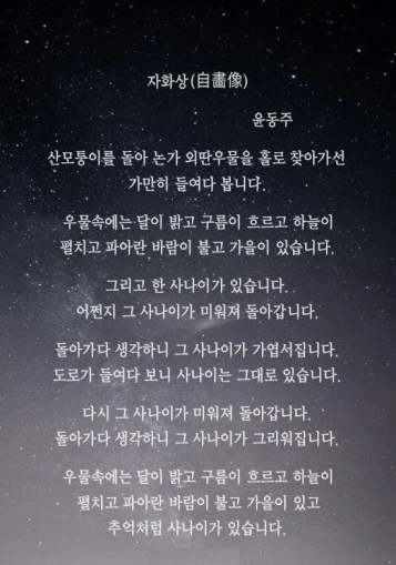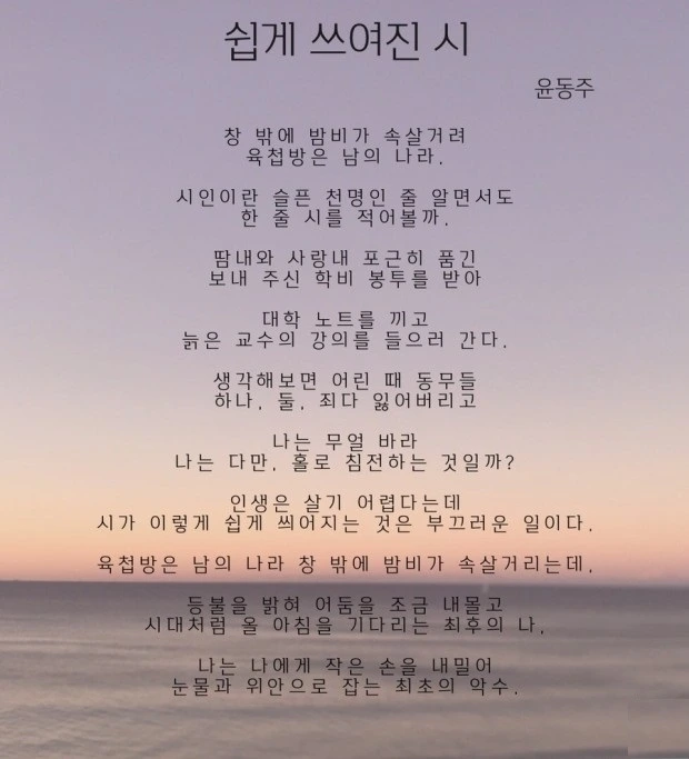 허나, 윤동주가 왜 독립운동가인지, 독립시인이지도 모르고, 그저 유명한 시인이려니 하고 알고 있어서는 그가 그렇게 희망했던 독립을 맞은, 그가 그렇게 사랑했던 민족으로서의 자격이 없다고 본다.