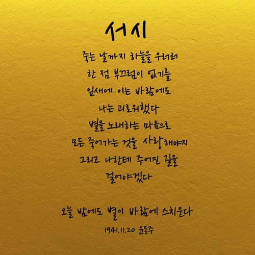 윤동주의 유시는 해방 후 연희전문 시절 절친한 벗이었던 강처중이 자신이 보관하고 있던 유고와 후배 정병욱이 가지고 있던 필사본 시집 등 31편의 시를 모아 1948년 1월 정지용의 서문과 강처중의 발문을 붙인 시집 <하늘과 바람과 별과 시>를 정음사에서 출간하면서 세상에 널리 알려졌다. 1968년 11월에 유작 <서시>가 새겨진 <윤동주 시비>가 모교인 연세대 교정에 건립되었다.