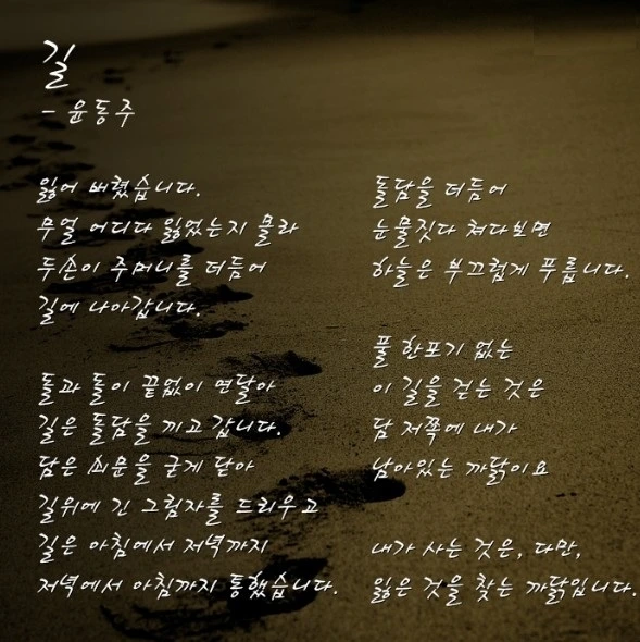 그런 점에서 윤동주는 자신의 시와 삶을 일치시키려 “잎새에 이는 바람에도” 괴로워했다. 그의 시는 곧 그의 삶을 대변한다. 하여, 내가 앞서 당신에게 그가 남긴 얼마 안 되는 그 피로 아로새긴 시로서 그의 생각을 읽어 보고 나서 판단하라 한 것이다. 그는 내내 자신이 걷고 있는 길이, 길 위에서 길을 잃은 것 같다고 느꼈고, 젊은이들이 조국의 독립을 외치며 죽어나가는 그 모진 현실의 풍파 속에서도 함께 행동하지 못하는 자신을 부끄러워했고, 두렵고 무서웠지만 그들과 함께 하겠다고 결심할 수 있었다.