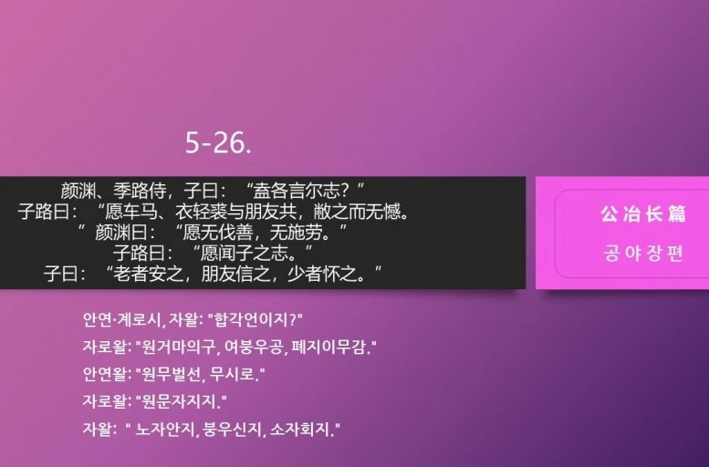 안연(顔淵)과 계로(季路)가 공자를 모시고 있었는데, 공자께서 “어찌 각기 너희들의 뜻을 말하지 않는가?”하셨다. 자로(子路)는 “수레와 말, 가벼운 갖옷을 입고 朋友와 함께 쓰다가 해지더라도 유감이 없고자 하옵니다.” 안연(顔淵)이 말하였다. “자신의 잘하는 것을 자랑함이 없으며, 공로를 과시함이 없고자 하옵니다.” 자로(子路)가 “선생님의 뜻을 듣고자 하옵니다.” 하자, 공자께서 말씀하셨다. “늙은이를 편안하게 해 주고, 친구들에게는 미덥게 해 주고, 젊은이를 감싸주고자 한다.”