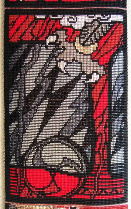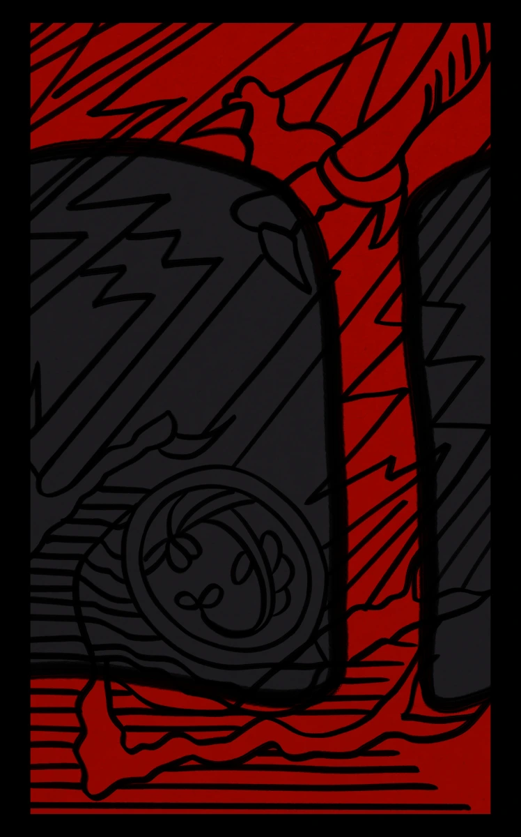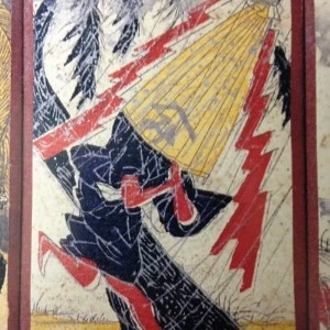 일단 문처럼 생긴 그림은 ‘라쇼몬’이라는 것으로 일본인들이 생각하는 ‘죽은 사람을 내보내는 일종의 문’으로 저승에 들어가는 문이다. 그 쌍피 뒷면으로 보이는 것은 저승 세계이며, 번개가 떨어지는 모습을 묘사하고 있고, 라쇼몬 쪽에도 라이진(雷神)의 태고(太鼓)와 그것을 주우려는 오니(鬼)의 손이 그려져 있는 것을 확인할 수 있다. 그렇게 이 그림들은 주인공이 바뀌고 연상이 확장되면서 그려진 산물인 것이다.