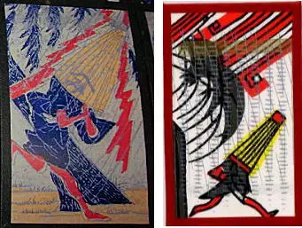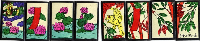 위 그림에 나오는 벼락을 몰고 다니는 신과 바람을 몰고 다니는 신이 가지고 있는 손에 들린 물건을 잘 보면, 하나후다(花札)의 그림에 나오는 것과 같은 것을 찾을 수 있다.