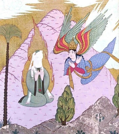 무함마드가 마흔 살이 될 무렵 그는 동굴에 들어가 명상 생활을 하고 있었다. 그러던 중 갑자기 밝고 거대한 빛이 무함마드를 덮치는 바람에 그만 기절하고 말았다. 이때 가브리엘이 나타나 무함마드를 깨워주었다. 그리고 거칠게 무함마드의 목을 쥐어 잡고는 기이한 문자가 적힌 천을 펼쳐 보이며 읽게 했다. 그러나 당시 무함마드는 글도 읽지 못하는 무식쟁이여서 가브리엘이 대신 읽어주었다.