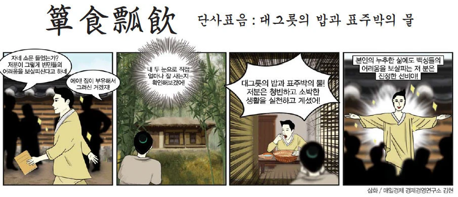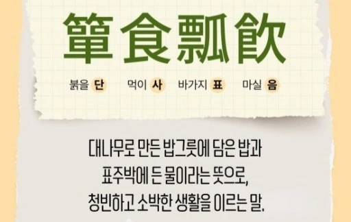 인간의 본성상 어느 누구도 일부러 가난한 생활을 선호하진 않는다. 그래서 단사표음은 현대의 곡학아세 하는, 유학을, 그리고 공자를 일반인의 생각과 유리된 특별하고 범인(凡人)들이 흉내 낼 수 없는 저 먼 곳의 형태를 알 수 없는 것으로 만들어 버리는 우를 범하고 말았다. 시골에 내려가서 아무도 없는 산에 자가 격리의 형태로 자연인이 되는 것이 좋아서 한다는, 청빈한 생활을 강조하는 것으로 포장되고 만 것이다.
