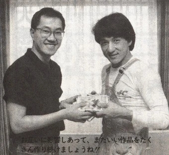 그런데 보통 라디오나 음악 등을 들으며 작업을 하는 다른 만화가들과는 달리 토리야마는 자신이 좋아하는 성룡의 영화를 틀어놓고 원고를 그리고 있었다. 이를 본 토리시마는 그렇게 성룡이 좋으면 그런 무술 만화를 그려보는 것은 어떠냐고 제안하게 된다. 거기에 서유기에서 아이디어를 따와 시험 삼아 그리게 된 것이 <드래곤 보이>라는 단편으로, 이 만화가 그를 전설로 만들어준 <드래곤볼>의 시초가 된다.