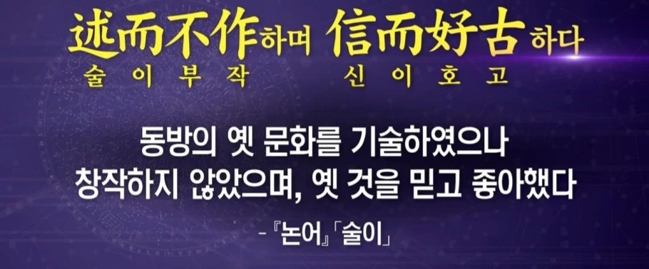 그 유명한 ‘술이부작(述而不作)’이라는 문구로 시작하는 ‘술이(述而)편’의 첫 장이다. 하도 유명한 문구에 대해서는 저마다 안다고 설치고 출판물에 오역을 다 싸놓은 것들이 많아 더욱 주의해서 읽어야 한다고 강조한 바 있다. 예컨대, 이 내용에 대해서도 공자의 고전에 대한 애호와 그의 겸허한 마음가짐을 엿볼 수 있다는 정도로 해석하면서 저술에 대한 겸양의 뜻으로 보는 것이 정설인 양 언급되고 있다.