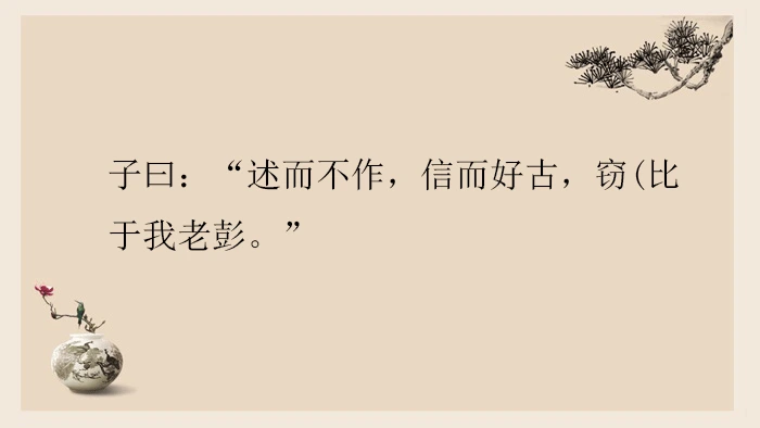 공자께서 말씀하셨다. “전술(傳述)하기만 하고 창작하지 않으며, 옛 것을 믿고 좋아함을 내 저으기 우리 노팽(老彭)에게 견주노라.”