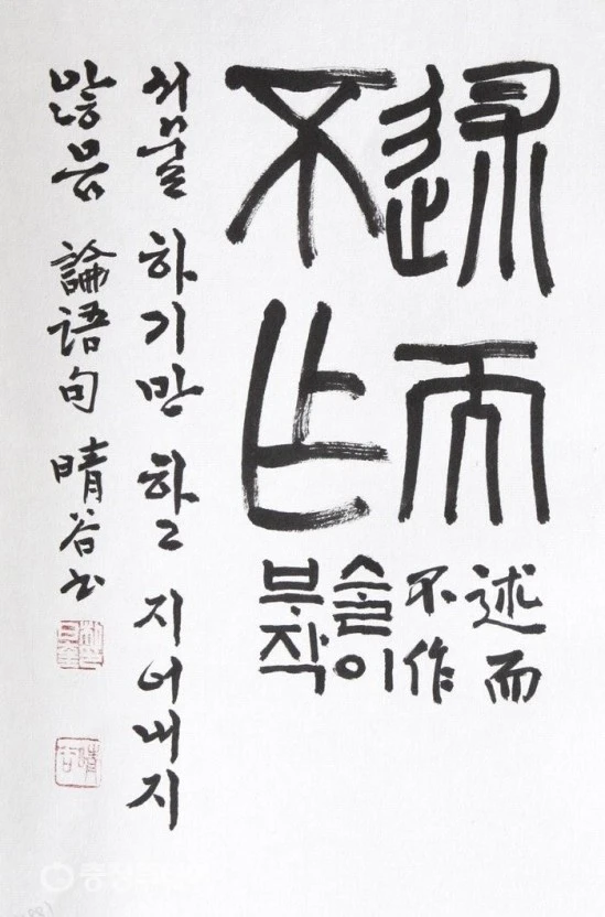 ‘作’을 창작이라 하였다. 그런데 여기서는 ‘不作’이라고 한 단어로 묶여 있다. 부정어는 무언가를 하지 말라는 금지의 의미로 사용된다. 감히 새롭게 쓰지 않는다는 겸양의 의미가 표면적인 것이라면, 그 단어의 속에는 제대로 알지 못하면서 함부로 쓰는 자들에 대한 일격으로 날리는 10톤짜리 철퇴가 들어 있다.