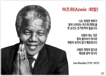 감옥에서 그는 젊음을 바쳐 노인이 되었다. 노인 만델라는 감옥을 들어갈 때와 달리 이미 큰 그릇으로 완성되어 세상에 나왔다. 인간성을 죽이기 위해 가두어 놓은 감옥에서 그는 더욱 성숙한 인간이 되어 스스로들 완성시키는 수양을 멈추지 않았던 것이다.