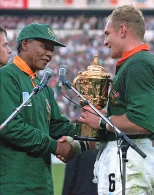 결승전에서 만델라는 주장 등번호 6번이 적힌 유니폼을 입고 경기장에 나타났다. 그리고 그날 기적처럼 남아공 럭비 대표팀은 뉴질랜드 대표팀을 꺾고 우승했고, 그날은 남아공 전체의 축제일이 되었다. 우승 트로피를 백인 주장에게 전달한 것 역시 만델라였다. 이후 이는 클린트 이스트우드 감독의 영화 <인빅터스> 로 영화화되었다.(만델라 역에 모건 프리먼, 럭비팀 주장 프랑수아 역을 맷 데이먼이 연기했다.)
