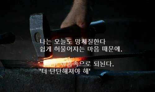 아니다. 정작 그런 생각들이 처음에 들었더라도 당신은 어느 사이엔가 당신을 단련하고 있었던 것이다. 당신의 그 힘겨웠던 하루하루가 그 시기에 당신을 때리고 아프게 했던 그 망치질들이 훗날 더 큰 일을 하기 위한 그릇으로 만들기 위한 세상의 담금질에 끊임없이 시험당하고 있었던 것이다. 그 수많은 망치질은 이제 당신을 어지간한 시련에는 꿈쩍도 하지 않은 명검으로 만들었다.