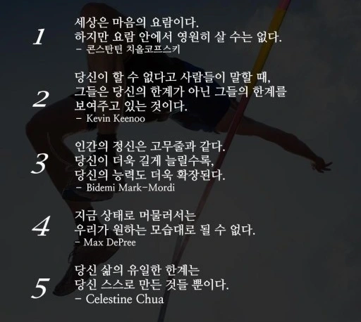 그때가 되면 당신은 안락하게 그저 그 상태를 누리고 싶은가? 아니면 당신의 한계를 뚫고자 더 노력하고 다리에 힘을 주는가? 성공하고 나서의 상상을 벌써부터 꿈꾸라는 말이 아니다. 성공하기 전과 성공한 후가 크게 다르지 않다는 점을 알려주는 것이다.