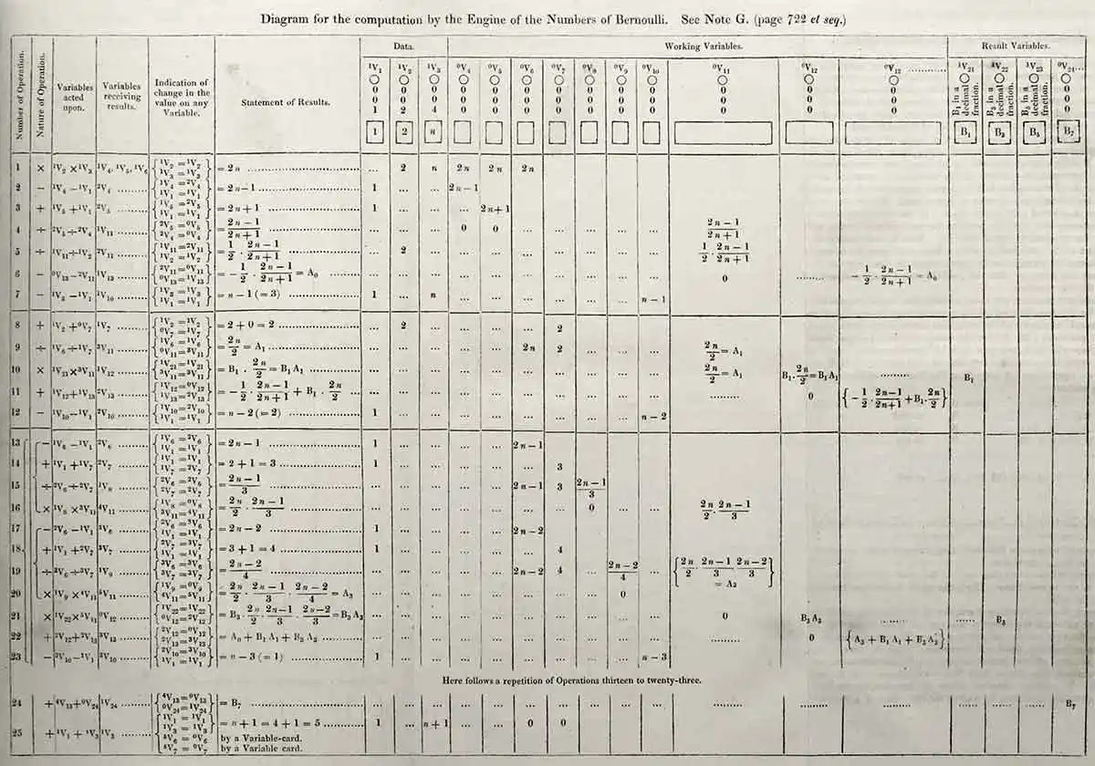 해석 기관에 대해 설명하는 것은 당시로선 매우 어려운 작업이었다. 러브레이스는 찰스 배버지의 기계인 ‘해석기관(analytical engine)’에 관한 노트를 남겼는데, 그 노트는 기계가 작동하는 방식을 적은 최초의 ‘알고리즘’으로 알려져 있다. 그 노트의 주석문은 알파벳 순서대로 A부터 G까지의 각 파트로 이루어져 있었고, G 파트에는 ‘베르누이 수’를 구하는 해석기관용 알고리즘이 실려있었는데 이것이 현대에 들어서 최초의 컴퓨터 프로그램으로 인정되어 에이다에게 최초의 컴퓨터 프로그래머라는 수식어가 붙게 되었다.
