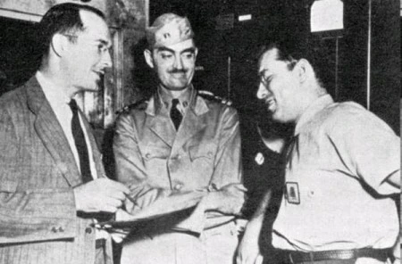 필라델피아 해군 병기창에서 근무하던 시절의 SF 작가 세 사람. 왼쪽부터 로버트 하인라인, L. 스프레이그 디 캠프, 아이작 아시모프. 1944년.