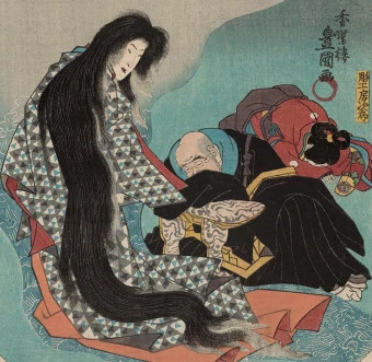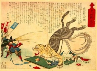 <호열자퇴치(虎列刺退治)>(1886년) 사람들을 짓누르고 있는 괴수는 호랑이(머리),늑대 (몸체),너구리(고환)을 합체한 것이며, 위생대가 소독약을 분사하는 그림.