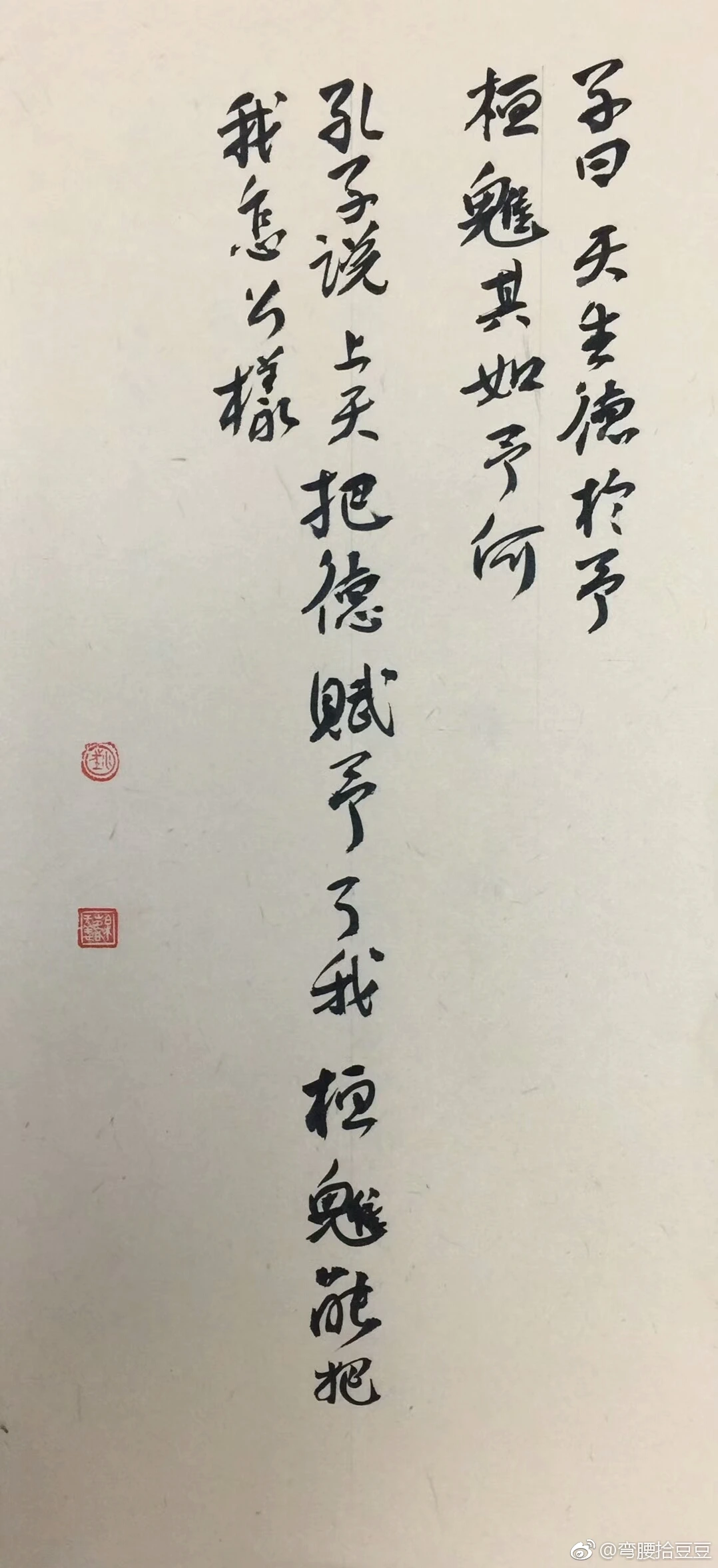공자는 배우고 수양을 거듭하는 과정을 통해, 자신이라는 존재의 의미와 가치를, 하늘이 도(道)가 무너진 어두운 세상을 바로잡기 위해 자신을 내셨다고 자부(自負)하였다. 이것은 자신이 공부하고 수양을 하는 평생을 거쳐 확고해져 갔고, 제자들에게 자신이 배우고 익힌 것을 가르치고 경험을 쌓아가면서 더욱더 확신했다. 즉, 자신을 향한 하늘의 뜻 곧 천명(天命)을 확신했기에 더더욱 생사(生死)에 대한 집착이나 두려움을 초월할 수 있었다. 이 장에서 공자가 언급한 ‘하늘이 이 같은 덕(德)을 주셨다’ 함은 자신에게 주어진 그 천명(天命)을 재확인한 것이다.