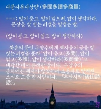 글도 마찬가지이다. 글을 잘 쓰기 위한 조건으로 구양수(歐陽修)가 ‘多聞多讀多商量(많이 듣고, 많이 읽으며, 많이 생각해야한다.)’을 제시한 것은 이 장에서 제시한 차선의 배움을 강조한 말과 크게 다르지 않다. 그 연장선상에 고전이 강조되는 것은 앞서 작곡이든 책에서든 다르지 않다. 좋은 것이 무엇인지 추천해줄 선생님도 없을 때는 역시 몇 세기에 걸쳐 검증받은 고전은 교재로 삼기에 실패할 확률이 현저히 낮다.