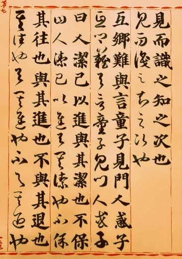 互鄕難與言, 童子見, 門人惑, 子曰: “人潔己以進, 與其潔也, 不保其往也. 與其進也, 不與其退也, 唯何甚? ”
