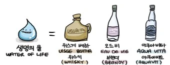 그 영향을 받은 탓인지 증류주를 대표하는 위스키도 이것을 그대로 켈트어로 번역한 ‘usquebaugh’, 혹은 갈리아어 ‘uisce beatha’의 발음에서 변형을 거치면서 전성된 것이다. 프랑스어 표현인 ‘오드비(eau de vie)’나 북유럽의 증류주 아쿠아비트(akvavit)도 마찬가지이다. 그렇게 생각하면 앞서 언급했던 영어의 ‘spirit’도 어떻게 지어진 것인지 충분히 유추하고도 남음이 있는 명명, 되시겠다.