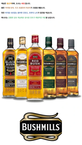 아이리시 위스키 중 상위권에 속하는 브랜드. 증류소가 벨파스트에 있기 때문에 ‘신교도들의 위스키’라고 부르는 경우가 있다. 부시밀, 부시밀즈, 부쉬밀 등의 다양한 표기로 불렸었는데, 현재는 국내 표기가 ‘부쉬밀’로 굳혀졌다.