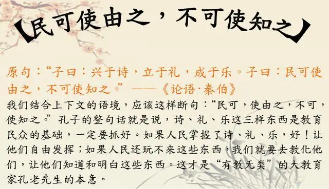 백성을 따르게 하는 것은 강압적으로도 따르게 할 수 있는 것이고 올바른 도리로 기꺼워하면서 따르게 할 수도 있는 것이다. 그것을 공자는 구분하지 않았다. 그러고 나서 ‘알게 할 수는 없는 것이다.’라고 다시 축약하여 말한다. 결국 위정자가 백성들을 어떤 방식으로든 따르게 할 수는 있으나 그것을 왜 따라야 하는지 어떤 원리를 갖추고 있기에 따라야 하는지를 이해시킬 수는 없다는 말이다.