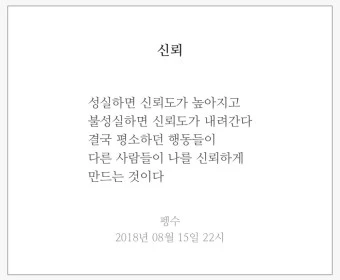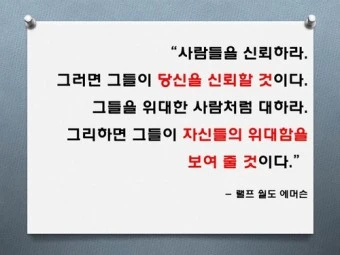 당신이 신뢰를 사람됨을 그 정성을 있는 그대로 쏟아부어 키워나간 신뢰관계는 신의라는 이름으로 자라기 시작하는 것이지 원래부터 마음속에 갖추고 있는 것이 아니라는 말이다. 그것은 상대에게도 마찬가지이지만 당신의 마음에도 마찬가지인 셈이다. 누구나 이익을 앞에 두고 더 나은 상대를 만났을 때 갈아타고 싶다는 본능에 흔들린다. 하지만, 그렇게 이리저리 이익만을 위해 옮겨 다니는 날파리가 다른 사람들의 신뢰를 얻기 어렵다는 것은 이제 글을 읽기 시작한 초등학생도 본능적으로 아는 일이다.