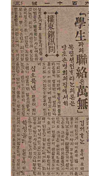 독자적으로 독립운동 계획을 추진하던 학생들은 조선기독교청년회(YMCA)의 총무인 박희도(朴熙道)로부터 천도교와 기독교가 연합하였으니 동참하라는 통지를 받았다. 이에 학생 대표들은 2월 25일 회의를 열고 연합 전선에 참가하여 3월 1일 탑골공원에 집결하며, 형편에 따라서는 학생 독자적으로 독립선언 대회를 개최할 것 등을 결의하였다. 이로써 천도교 · 기독교 · 불교 학생이 참여한 민족대연합 전선이 구축된다.