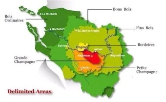 보르드리(Borderies) 지역(그랑드 샹파뉴 북쪽에 위치)에서 만들어진 제품은 더 감미롭고 부드러운 풍미를 지닌다. 이 세 지역을 둥글게 감싸는 모양으로 위치한 펭 부아(Fins Bois), 봉 부아(Bons Bois), 부아 오르디네르(Bois ordinaires) 지역은 좀 더 토속적이며 투박한 스타일의 브랜디를 생산하는데, 실제로 이 지역 명칭을 달고 판매되는 경우는 매우 드물다. 한편, 특별한 명칭인 핀 샹파뉴(fine champagne)는 그랑드 샹파뉴와 프티트 샹파뉴를 블렌딩 한 것으로, 그랑드 샹파뉴의 비율이 최소 50% 이상이다.