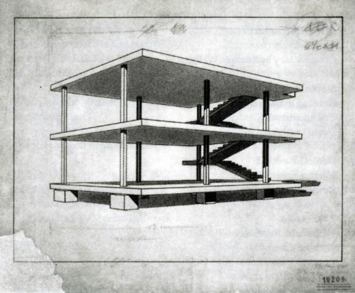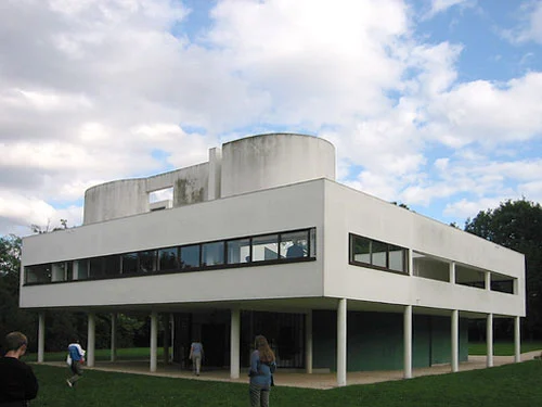 1. 철근 콘크리트 기둥인 필로티(pilotis)로 무게를 지탱하고 건축 구조의 대부분을 땅에서 들어 올려 지표면(1층)을 자유롭게 이용하도록 만든다.