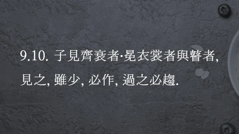 공자께서는 齊衰(상복)를 입은 자와 관을 쓰고 衣裳을 차려입은 자와 봉사(장님)를 보시면 그들이 비록 나이가 적더라도 반드시 일어나셨고, 그 곁을 지나실 때에는 반드시 종종걸음을 하셨다.