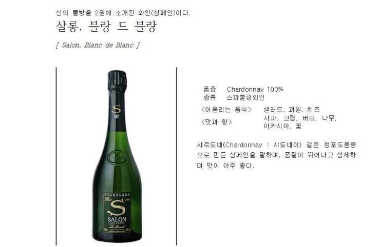 살롱은 다른 샴페인 하우스와는 달리 오직 한 가지 샴페인만 생산하는 것으로도 유명하다. 샤르도네 품종으로 유명한 꼬뜨 데 블랑 지역의 1헥타르 그랑 크뤼 싱글 빈야드에서 재배한 포도만 사용하며 작황이 좋은 해에만 생산하기 때문에 ‘돈이 있어도 구하기 힘든 샴페인’으로도 알려져 있다. 섬세한 풍미를 위해 병입 후 평균 10년 더 숙성해 출고한다.