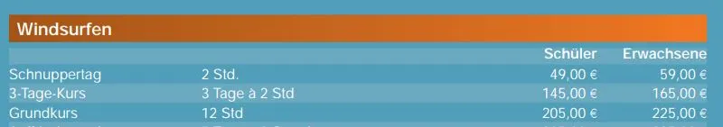 우리는 3일 동안 하루 4시간씩, 총 12시간 수업을 들었다. 위는 당시 수업을 들었던 수상 스포츠 센터의 현재 가격표인데, 가격이 조금 오른 것 같다. 나는 당시 200유로 정도 지불한 것으로 기억한다. 선생님 한 분에 학생은 친구와 나, 둘 뿐이었다.