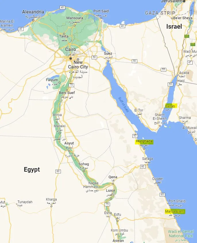 하지만 위 지도에서도 볼 수 있듯이 다합(Dahab) 앞바다는 큰 바다가 아니다. 진짜 크고 깊은 홍해는 후르가다(Hurghada)와 마르사알람(Marsa Alam) 쪽에 있다. 이곳에서 다이빙 사파리와 같은 프로그램을 통해 보트를 타고 바다 안 쪽으로 들어가야 듀공, 돌고래, 상어와 같은 큰 바다생물을 볼 수 있다.
