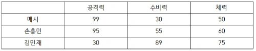 이때 이 데이터를 바탕으로 세 선수는 다음과 같은 행렬로 표시할 수 있다.
