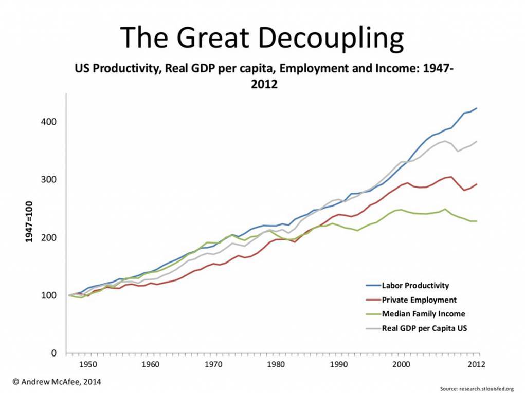 또한 1980년대부터 GDP와 생산성은 올라가는데 고용과 임금은 떨어지는 디커플링이 발생하며 양극화가 심해지고 있습니다. 이는 부자 감세와 기업에 대한 규제를 없애는 신자유주의 때문이기도 하지만, 그보다는 자동화로 인해 양질의 일자리가 사라진 것이 가장 큰 이유 중 하나입니다.
