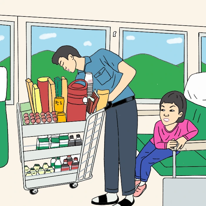 엄마도 나도 지쳐 갈 때쯤 열차 문이 열리더니 아저씨가 작은 손수레를 밀고 들어오며 이상한 말투로 소리쳤다.