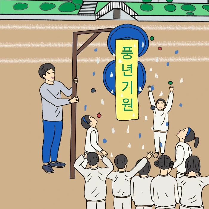 "조금만 더 조금만 더" 모두 같은 마음으로 오자미를 던져 맞추니 어느 순간 박이 열리며 종이가루가 뿌려져 나왔다. 그리고 [ 풍년기원 ] 글귀가 적힌 기다란 종이도 함께 보였다.