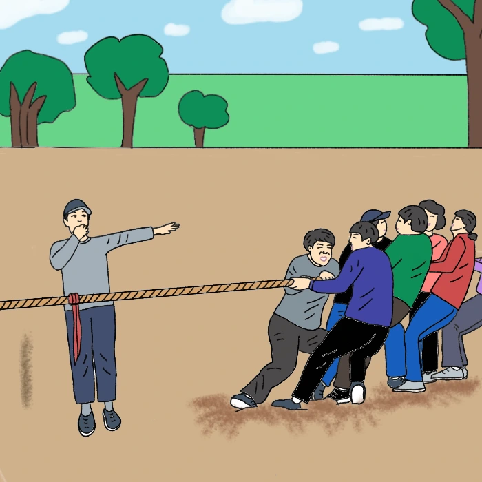 "땅"소리와 함께 "영차 영차 영차" 기합소리가 양쪽에서 울려 퍼졌고 "뒤로 누워!!"라는 절박한 외침에 양쪽 모두가 몸을 최대한 뒤로 눕히며 버티니 줄 중간에 묶어놓은 빨간 끈이 이쪽으로 조금 넘어갔다 다시 돌아와 저쪽으로 조금 넘어갔다 넘실넘실 춤을 추니 끈만 바라보고 있던 우리 눈도 요리 굴러졌다 저리 굴러졌다 눈이 빠질 지경이다.