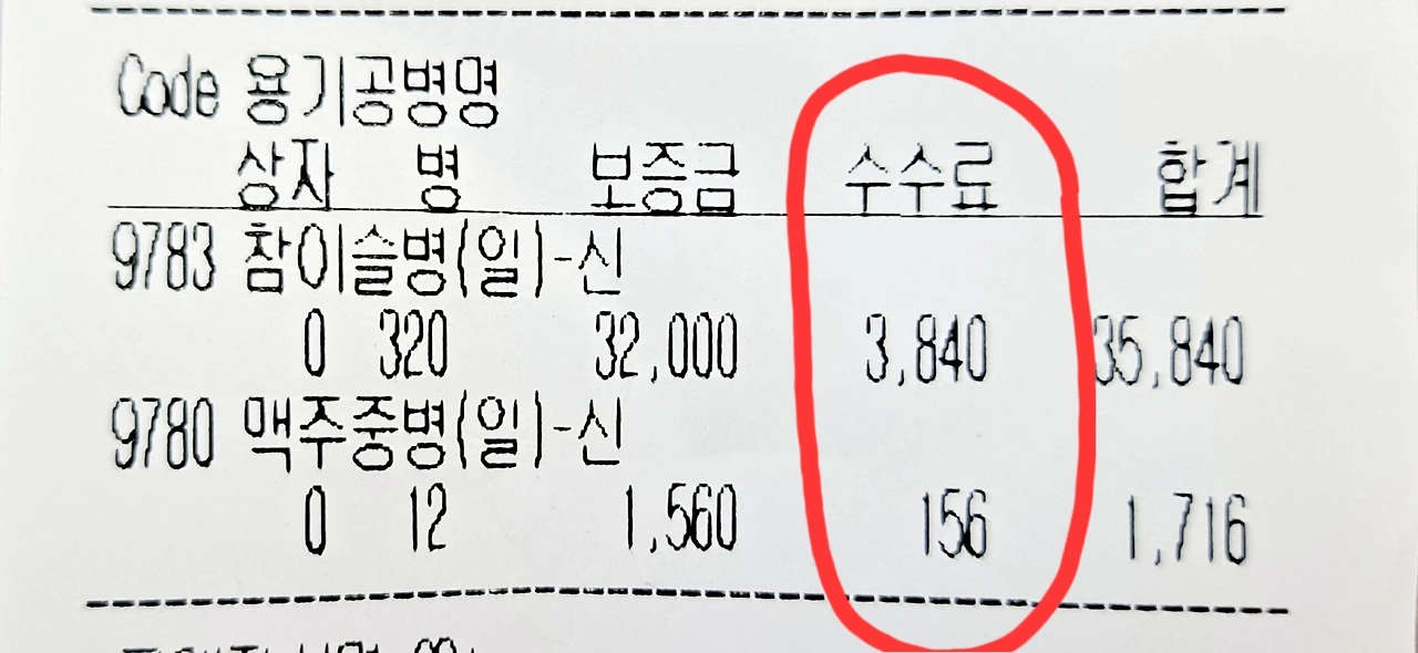 받은 공병은 소주 12원, 맥주 13원의 수수료 값을 받고 주류도매사에 넘긴다. 오늘 공병 영수증을 참고하자면 소주 320병 수수료 3,840원 맥주 12병 수수료 156원을 받았다.